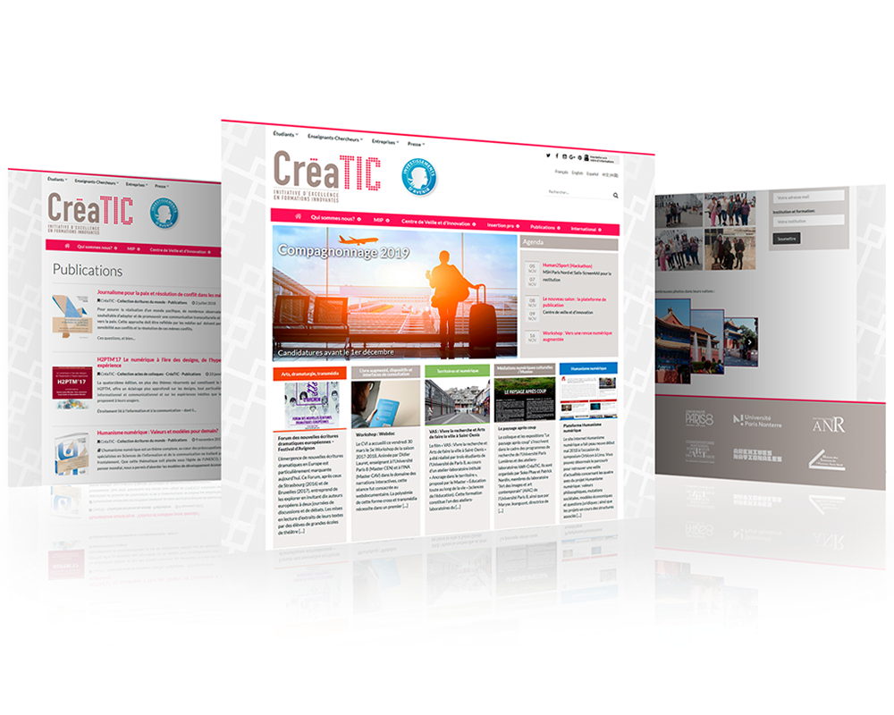 Travail effectué : Conception de l'interface graphique du site internet et développement. CréaTIC est un programme expérimental qui ambitionne de développer un nouveau modèle pédagogique par la recherche-création du numérique, de transformer en profondeur les formations en changeant le rapport au savoir par l'expérience et la distance critique.