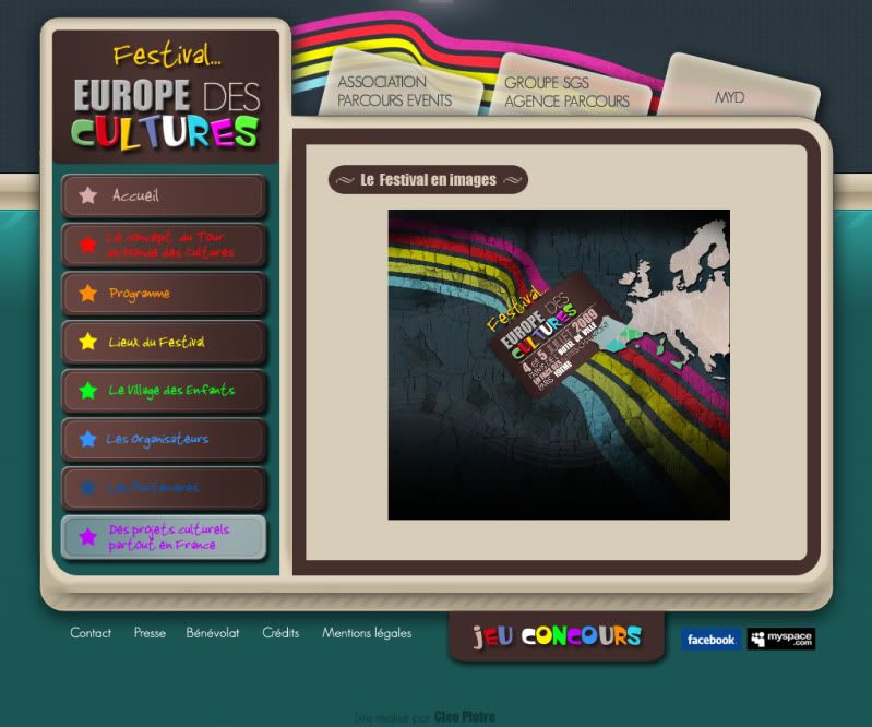 Conception du site pour le Festival Europe des Cultures, organisé par la mairie de Paris 18e - Design graphique (Photoshop, Illustrator) - Programmation HTML/CSS (Dreamweaver) - Flash