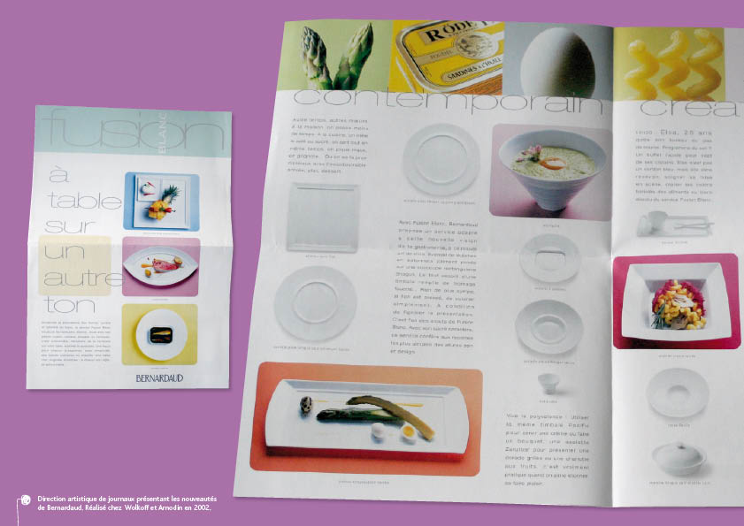Description de la référence portfolio : Direction artistique de journaux présentant les nouveautés de Bernardaud. Réalisé chez Wolkoff et Arnodin en 2002.