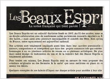 Date de mise à jour référence portfolio : 19/09/2018 13:08:18 Titre : Plaquette de présentation "LesBeauxEsprits" Description : Plaquette réalisée pour le collectif "LesBeauxEsprits" Evaluation de la référence portfolio : 3.67/5 ( 3 évaluation(s)) Thème(s) : musique Type(s) : affiche/flyer |